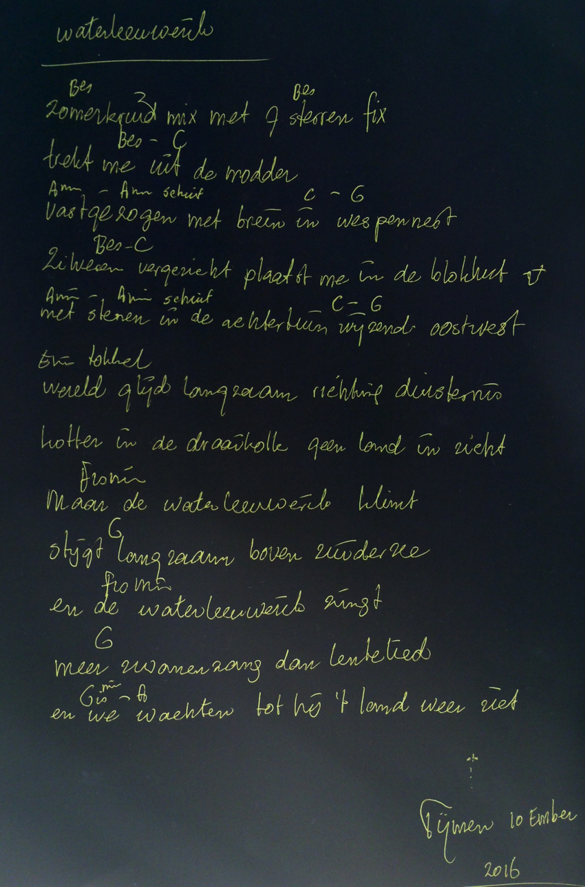 MOEDEROOG menswolf blaft me weg naar Uddel naar aarden wal en grijze jagers riddle als natuurlijk middel hier wil ik staan vandaag hier wil ik zijn licht laat ons langzaam in de steek luister naar het duister in deze laatste week van het meer naar de zee via lange beek ik kom weer terug wanneer het donker wijkt ik kom weer terug wanneer de zon weer schijnt ik kom weer terug wanneer het duister wijkt ik kom weer terug wanneer de zon weer schijnt moederoog 16 meter diep |